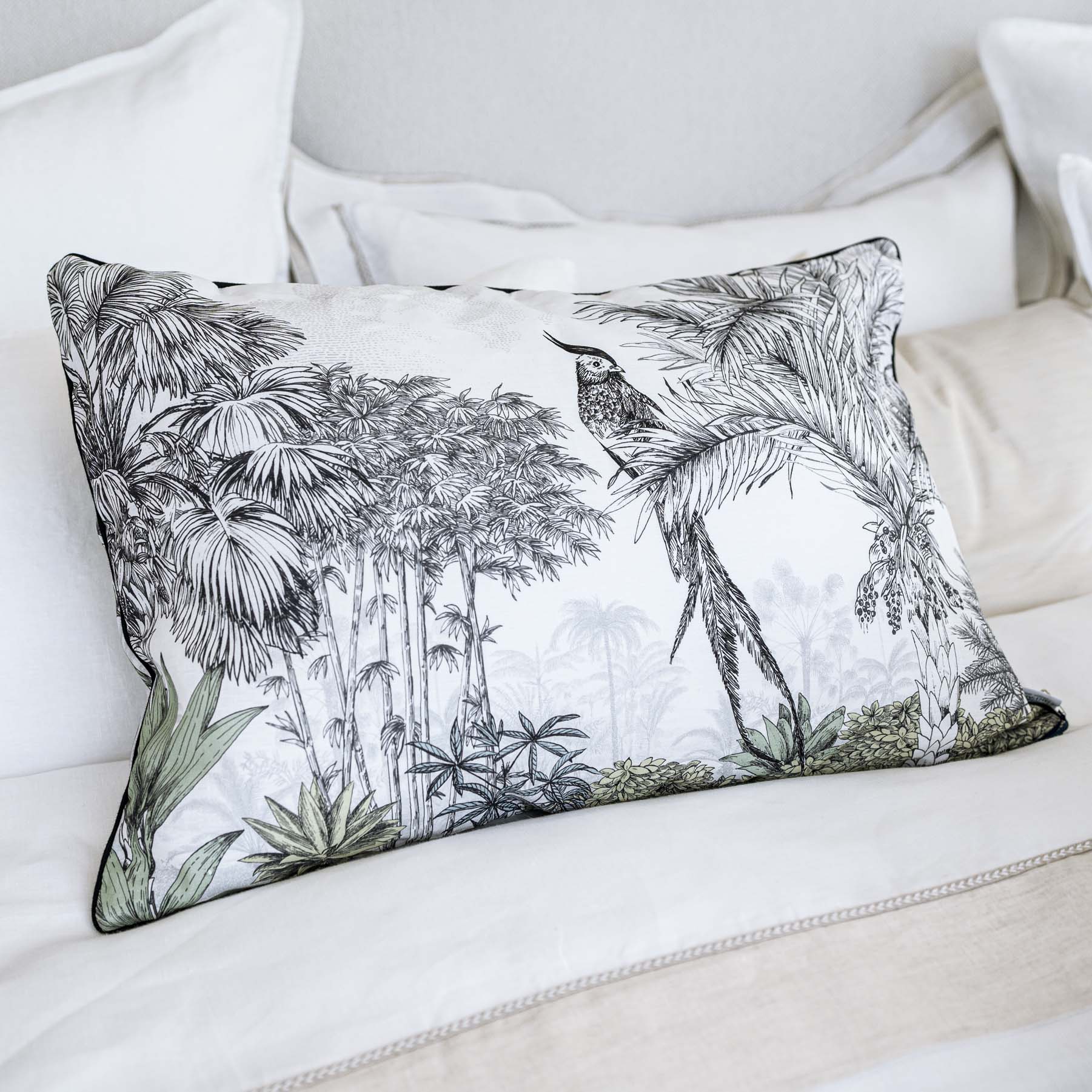 This cushion cover is the retranscription, in textile form, of the great AMAZONE panorama, a wallpaper available at Isidore Leroy. The front and back of the cover feature different but complementary designs, both created by hand. A story of birds of paradise in the heart of a living nature made of bamboos and palm trees. A decor enhanced by a few hints of colour that give more soul to this wild life.